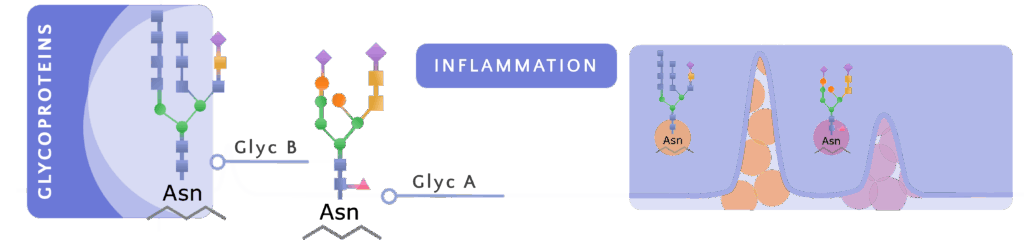 Las proteínas de fase aguda presentan estructuras glicadas características —N-acetilglucosamina y N-acetilgalactosamina (GlycA) y N-acetilneuramínico (GlycB)— que pueden cuantificarse directamente en plasma mediante espectroscopía de RMN. La medición de GlycA y GlycB refleja un conjunto integrado de proteínas proinflamatorias, en lugar de un único marcador aislado, lo que proporciona una evaluación más robusta y reproducible del estado inflamatorio sistémico.