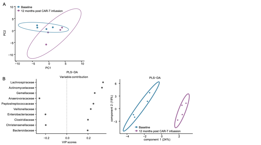 The study analyzed fecal and serum samples from 51 patients enrolled in the CARTBCMA-HCB-01 clinical trial, collected at different time points: before apheresis, before lymphodepletion, and after CAR-T infusion. The microbial composition was characterized by 16S rRNA sequencing, while the metabolomic profile was evaluated by nuclear magnetic resonance (NMR) and gas chromatography–mass spectrometry (GC–MS), allowing quantification of 35 fecal metabolites and serum short-chain fatty acids (SCFAs). In parallel, CAR-T cell persistence and clinical response were monitored at days 28, 100, and 180.